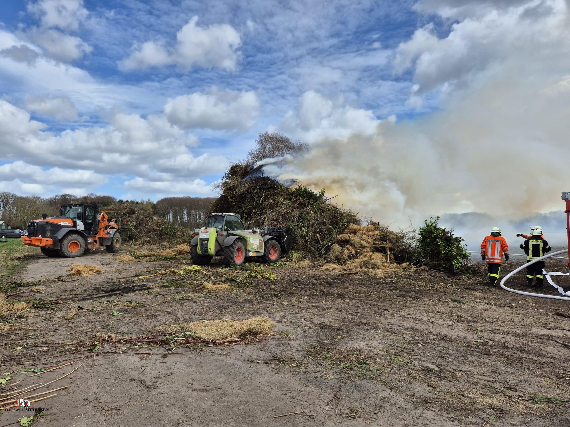 05.04.2026 Klein Meckelsen (as). Am Ostersonntagmittag ist das aufgeschichtete Osterfeuer in der Straße "Zum Schwarzen Kamp" in Klein Meckelsen aus ungeklärter Ursache vorzeitig in Brand geraten.