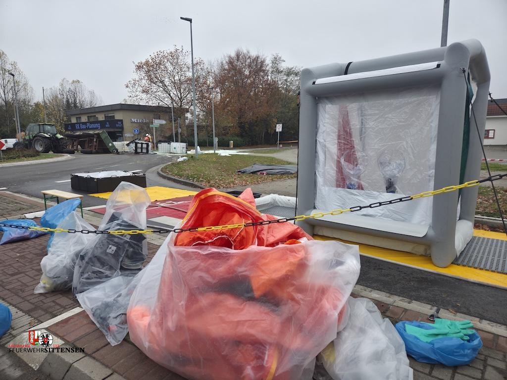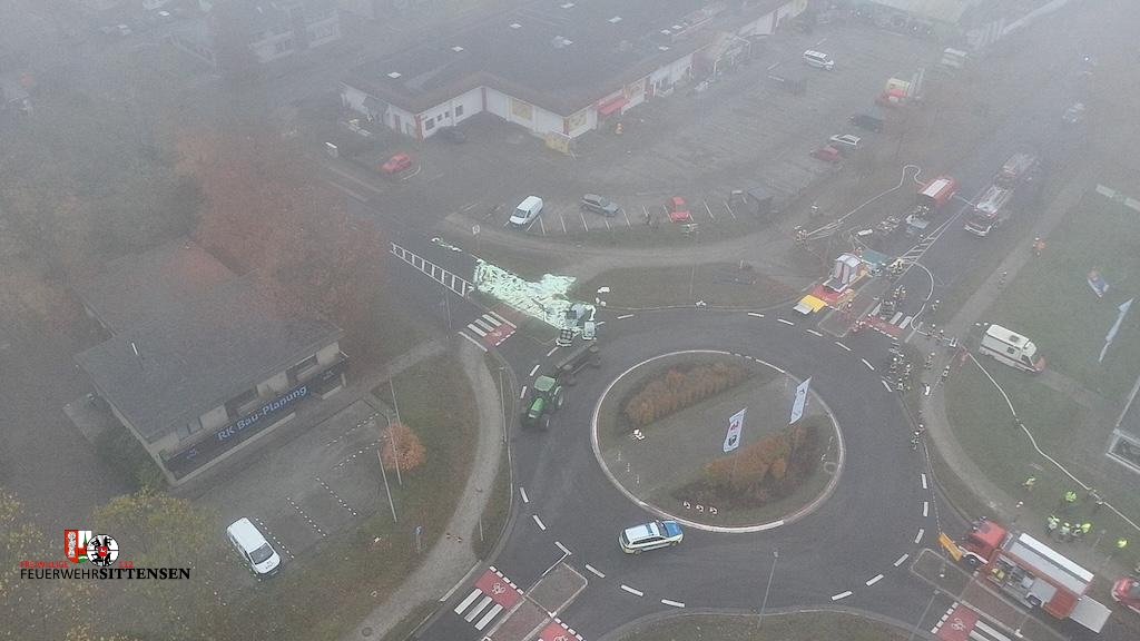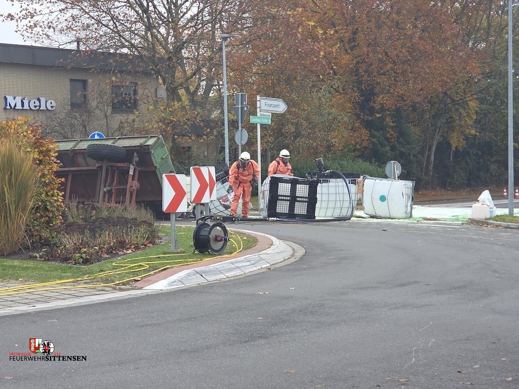 Beim Eintreffen der ersten Kräfte am Kreisel an der B71 lag ein Anhänger eines Taktors im Kreisverkehr auf der Seite. Der Anhänger war mit vier IBC-Containern beladen, die Propionsäure enthielten. Zwei der Behälter waren beschädigt, wodurch größere Mengen Flüssigkeit austraten. Der Fahrer hatte eigenständig versucht, das Ausbreiten der Säure zu verhindern, und zog sich dabei Verätzungen im Gesichtsbereich zu. Er wurde vom Rettungsdienst versorgt und anschließend in eine Klinik nach Bremen transportiert.