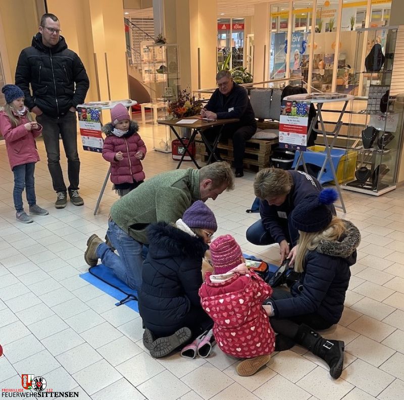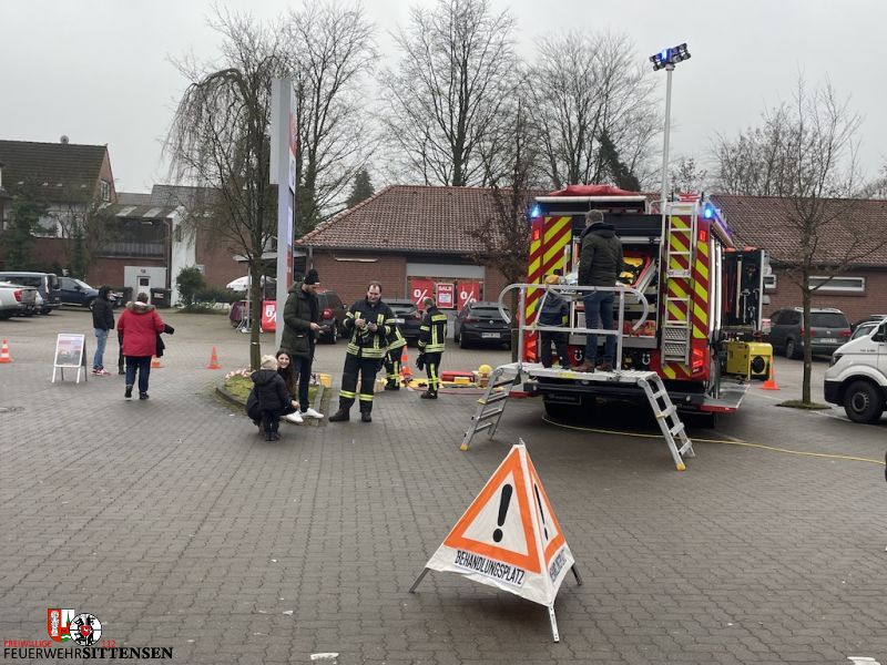 Die Feuerwehr Sittensen und der DRK-Einsatzzug hatten auf dem Parkplatz Ihre Einsatzfahrzeuge aufgebaut, sodass sich schon viele Besucher eingefunden hatten. Drinnen informierten dann der Verein zur Förderung der Notfallversorgung Sittensen – Zeven – Tarmstedt e. V über das Programm des Landkreises Rotenburg (Wümme) der Mobilen Retter. Jeder konnte auch eine Herz-Lungen-Wiederbelebung durchführen. Sogar die kleinen scheuten sich nicht davor. Der Förderverein Freunde und Förderer der Feuerwehr Sittensen und Blasorchester e. V. informierte über seine Arbeit. Sowie über das Thema Notruf. Gegen eine freiwillige Spende hatten sie draußen vor der Tür eine Bratwurst im Angebot. Am Einsatzfahrzeug bei der Feuerwehr konnten interessierte mit dem schweren Hydraulik Spreitzer Holzklötze hin und her stellen, um zu sehen wie schwer so etwas überhaupt ist. Der DRK-Einsatzzug hatte unter anderem seine Drohne mit im Gepäck. Die wird hauptsächlich für Personensuchen eingesetzt. Das Quad und das Motorrad von DRK und Feuerwehr waren ein beliebtes Fotoobjekt für die Kinder.