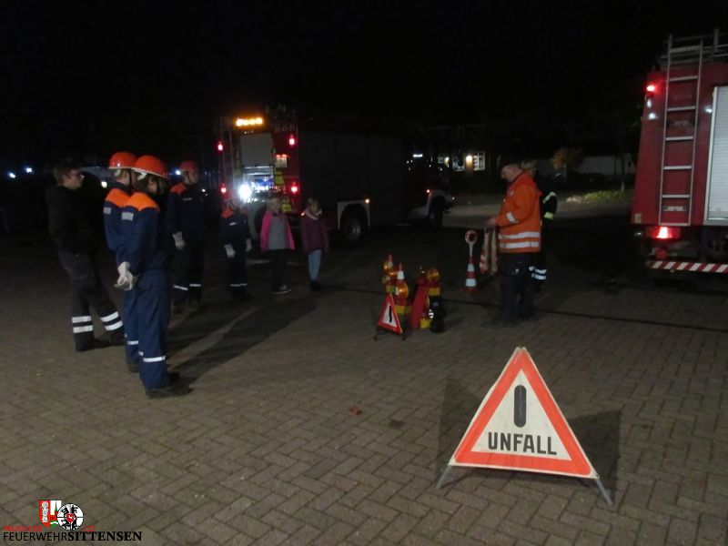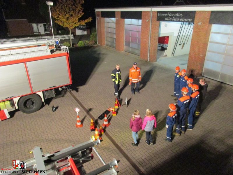 Die Sittenser Feuerwehrleute hatte auf dem Gelände einiges vorbereitet. Sie erklärten den Jugendlichen, wie eine Unfallstelle abgesichert wird und welche Möglichkeiten es an den Fahrzeugen gibt, um diese abzusichern. Anschließend ging es noch um das Ausleuchten einer Einsatzstelle. Hier wurde der große Lichtmast vom Löschgruppenfahrzeug ausgefahren und erklärt.